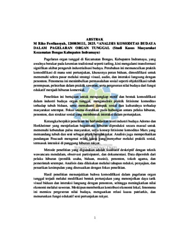 Pagelaran organ tunggal di Kecamatan Bongas, Kabupaten Indramayu, yang awalnya berakar pada kesenian tradisional seperti tarling, kini mengalami transformasi signifikan akibat pengaruh industrialisasi budaya. Perubahan ini memunculkan praktik komodifikasi di mana seni pertunjukan, khususnya peran biduan, dimodifikasi untuk memenuhi selera pasar melalui strategi visual, audio, dan interaksi langsung dengan penonton. Fenomena ini menimbulkan permasalahan sosial seperti objektifikasi tubuh perempuan, pelecehan dalam praktik saweran, serta pergeseran nilai budaya dari fungsi edukatif menjadi hiburan komersial. Penelitian ini bertujuan untuk mengungkap motif dan bentuk komodifikasi dalam industri budaya organ tunggal, menganalisis praktik fetisisme komoditas terhadap tubuh biduan, serta memahami dampak sosial dan kulturalnya terhadap masyarakat setempat. Fokus utama diarahkan pada hubungan antara pelaku hiburan, penonton, dan struktur sosial yang membentuk interaksi dalam pertunjukan. Kerangka berpikir penelitian ini berlandaskan teori industri budaya Adorno dan Horkheimer yang menjelaskan bagaimana hiburan diproduksi secara massal untuk memenuhi kebutuhan palsu masyarakat, serta konsep fetisisme komoditas Marx yang memandang tubuh dan seni sebagai objek bernilai tukar. Analisis juga memperhatikan pandangan Foucault mengenai relasi kuasa yang menyebar melalui praktik sosial, termasuk interaksi di panggung hiburan rakyat. Metode penelitian yang digunakan adalah kualitatif deskriptif dengan teknik wawancara mendalam, observasi partisipatori, dan dokumentasi. Data diperoleh dari pelaku hiburan (pemilik usaha, biduan, musisi), penonton, tokoh agama, dan pemerintah setempat. Analisis data dilakukan melalui tahapan reduksi, penyajian, dan penarikan kesimpulan yang disesuaikan dengan fokus penelitian. Hasil penelitian menunjukkan bahwa komodifikasi dalam pagelaran organ tunggal terjadi melalui modifikasi bentuk pertunjukan yang menonjolkan daya tarik visual biduan dan interaksi langsung dengan penonton, sehingga meningkatkan nilai ekonomi melalui saweran. Meskipun memberikan kontribusi ekonomi lokal, fenomena ini memicu pergeseran nilai budaya, menguatkan relasi kuasa patriarkis, dan menurunkan fungsi edukatif seni pertunjukan rakyat.