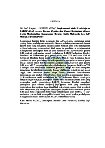 Lucpiah, Siti Lutfi (2026) Implementasi model pembelajaran RADEC (READ, ANSWER, DISCUSS, EXPLAIN, and Create) berbantuan Blooket untuk meningkatkan kemampuan berpikir kritis matematis dan self-motivation peserta didik. Sarjana thesis, UIN Sunan Gunung Djati Bandung.