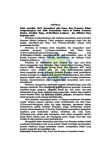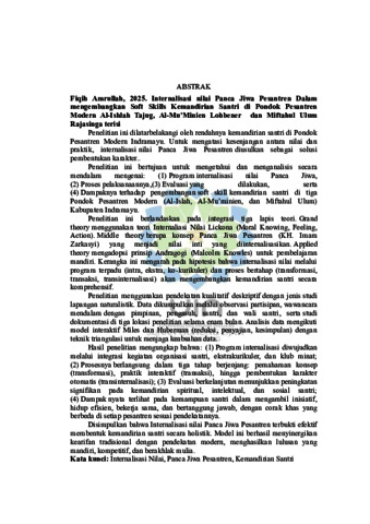 Penelitian ini dilatarbelakangi oleh rendahnya kemandirian santri di Pondok Pesantren Modern Indramayu. Untuk mengatasi kesenjangan antara nilai dan praktik, internalisasi nilai Panca Jiwa Pesantren diusulkan sebagai solusi pembentukan karakter. Penelitian ini bertujuan untuk mengetahui dan menganalisis secara mendalam mengenai: (1) Program internalisasi nilai Panca Jiwa, (2) Proses pelaksanaannya, (3) Evaluasi yang dilakukan, serta (4) Dampaknya terhadap pengembangan soft skill kemandirian santri di tiga Pondok Pesantren Modern (Al-Islah, Al-Mu’minien, dan Miftahul Ulum) Kabupaten Indramayu. Penelitian ini berlandaskan pada integrasi tiga lapis teori. Grand theory menggunakan teori Internaliasi Nilai Lickona (Moral Knowing, Feeling, Action). Middle theory berupa konsep Panca Jiwa Pesantren (KH. Imam Zarkasyi) yang menjadi nilai inti yang diinternalisasikan. Applied theory mengadopsi prinsip Andragogi (Malcolm Knowles) untuk pembelajaran mandiri. Kerangka ini mengarah pada hipotesis bahwa internalisasi nilai melalui program terpadu (intra, ekstra, ko-kurikuler) dan proses bertahap (transformasi, transaksi, transinternalisasi) akan mengembangkan kemandirian santri secara komprehensif. Penelitian menggunakan pendekatan kualitatif deskriptif dengan jenis studi lapangan naturalistik. Data dikumpulkan melalui observasi partisipan, wawancara mendalam dengan pimpinan, pengasuh, santri, dan wali santri, serta studi dokumentasi di tiga lokasi penelitian selama enam bulan. Analisis data mengikuti model interaktif Miles dan Huberman (reduksi, penyajian, kesimpulan) dengan teknik triangulasi untuk menjaga keabsahan data. Hasil penelitian mengungkap bahwa: (1) Program internalisasi diwujudkan melalui integrasi kegiatan organisasi santri, ekstrakurikuler, dan klub minat; (2) Prosesnya berlangsung dalam tiga tahap berjenjang: pemahaman konsep (transformasi), praktik interaktif (transaksi), hingga pembentukan karakter otomatis (transinternalisasi); (3) Evaluasi berkelanjutan menunjukkan peningkatan signifikan pada kemandirian spiritual, intelektual, dan sosial santri; (4) Dampak nyata terlihat pada kemampuan santri dalam mengambil inisiatif, hidup efisien, bekerja sama, dan bertanggung jawab, dengan corak khas yang berbeda di setiap pesantren sesuai pendekatannya. Disimpulkan bahwa Internalisasi nilai Panca Jiwa Pesantren terbukti efektif membentuk kemandirian santri secara holistik. Model ini berhasil menyinergikan kearifan tradisional dengan pendekatan modern, menghasilkan lulusan yang mandiri, kompetitif, dan berakhlak mulia.