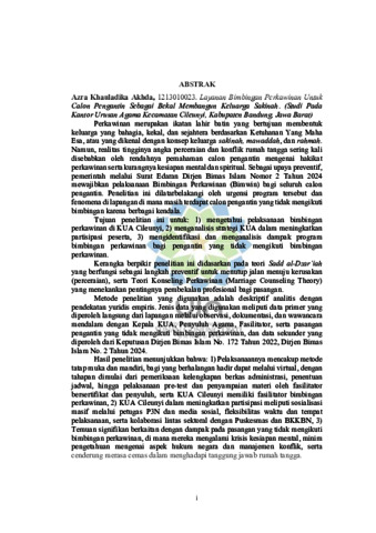 Akhda, Azra (2025) Layanan bimbingan perkawinan untuk calon pengantin sebagai bekal membangun keluarga sakinah: Studi pada Kantor Urusan Agama Kecamatan Cileunyi, Kabupaten Bandung, Jawa Barat. Sarjana thesis, UIN Sunan Gunung Djati Bandung.