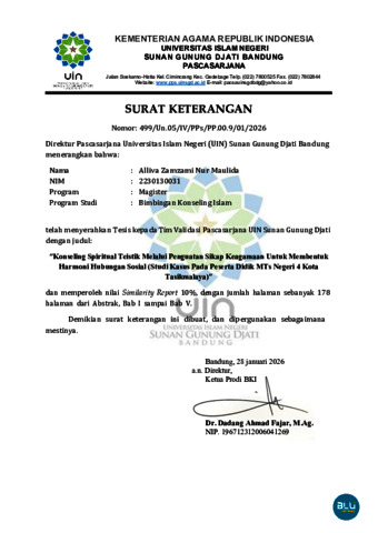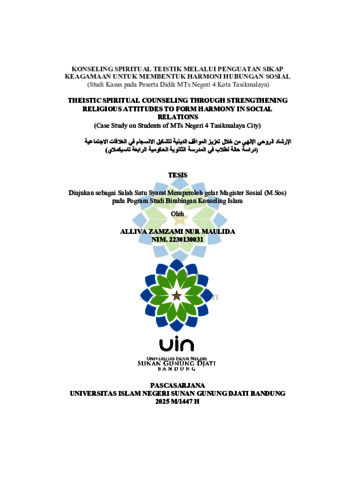Maulida, Alliva Zamzami Nur (2025) Konseling Spiritual Teistik melalui penguatan sikap keagamaan untuk membentuk harmoni hubungan sosial : Studi kasus pada peserta didik MTs Negeri 4 Kota Tasikmalaya. Masters thesis, UIN Sunan Gunung Djati Bandung.
