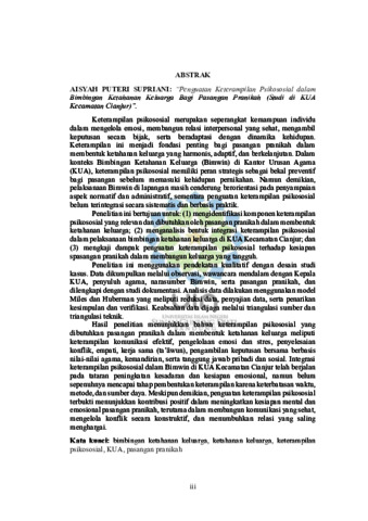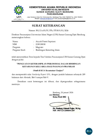 Supriani, Aisyah Puteri (2025) Penguatan keterampilan psikososial dalam bimbingan ketahanan keluarga bagi pasangan pranikah : Studi di KUA kecamatan Cianjur. Masters thesis, UIN Sunan Gunung Djati Bandung.