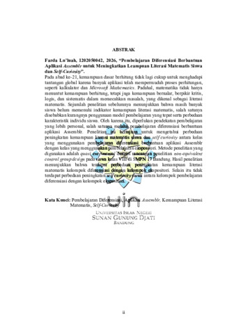 Lu'luah, Farda (2026) Pembelajaran Diferensiasi berbantuan aplikasi Assemblr untuk meningkatkan kemampuan literasi matematis siswa dan self curiosity. Sarjana thesis, UIN Sunan Gunung Djati Bandung.