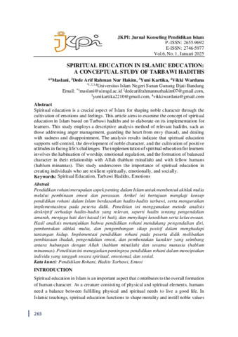 Maslan, Maslan and Hakim, Dede Arif Rahman Nur and Kartika, Yuni and Wardana, Vikki Spiritual education in islamic education: A Conceptual study of Tarbawi hadiths. JKPI: Jurnal Konseling Pendidikan Islam. ISSN 2746-5977