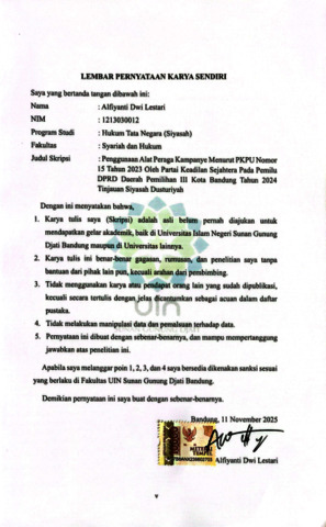 Lestari, Alfiyanti Dwi (2025) Penggunaan alat peraga kampanye menurut PKPU nomor 15 tahun 2023 oleh Partai Keadilan Sejahtera pada pemilu DPRD daerah pemilihan III Kota Bandung tahun 2024 tinjauan siyasah dusturiyah. Sarjana thesis, UIN Sunan gunung Djati Bandung.