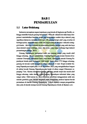 INDONESIA: Geofisika merupakan salah cabang ilmu fisika yang sangat menunjang untuk ilmu pengetahuan manusia di bagian eksplorasi sumber daya alam yang ada di bumi ini. Selain itu juga geofisika dapat digunakan untuk mepetakan suatu wilayah tanpa perlu perusakan lingkungan sekitar nya. Daerah penelitian berada di Gunung Papandayan, Kecamatan Cisurupan, Kabupaten Garut, merupakan salah satu gunung api yang masih aktif hingga saat ini dan tergolong gunung api stratovolcano. Penelitian ini akan menggunakan software SimPEG (Simulation and Parameter Estimation in Geophysics) untuk pemodelan inversi. Hasil pemodelan menunjukan sebaran anomali medan magnet pada daerah penelitian yang diinterpretasikan sebagai material susseptabilitas antara 0,01 SI–0,04 SI berupa dominasi oleh material batuan tufa vulkanik dan breksi vulkanik. Hasil tersebut diperoleh karena sifat batuan yang dominan dan juga bisa dikatakan sebagai cerminan untuk sejarah Gunung Papandayan itu sendiri. Pemodelan inversi 3D ini memiliki nilai error sebesar 1,58 yang menunjukan hasil pemodelan masih terdapat kekukurangan. ENGLISH: Geophysics is a branch of physics that greatly supports human knowledge in the exploration of natural resources found on this Earth. In addition, geophysics can be used to map an area without damaging the surrounding environment. The research area is located at Mount Papandayan, Cisurupan District, Garut Regency, which is one of the active volcanoes to this day and is classified as a stratovolcano. This study will use the software SimPEG (Simulation and Parameter Estimation in Geophysics) for inversion modeling. The modeling results show the distribution of magnetic field anomalies in the research area interpreted as susceptibility materials ranging from 0.01 SI to 0.04 SI, dominated by volcanic tuff rock and volcanic breccia. These results were obtained due to the dominant rock characteristics and can also be seen as a reflection of the history of Mount Papandayan itself. This 3D inversion modeling has an error value of 1.58, indicating that the modeling still has deficiencies.