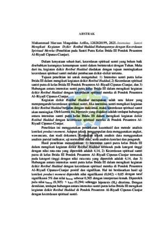 Marzan Muqoddas Arifin, Muhammad (2025) Intensitas santri mengikuti kegiatan dzikir Rotibul Haddad hubungannya dengan kecerdasan spiritual mereka : Penelitian pada santri putra kelas Ibtida III pondok pesantren Al-Riyadl Cipanas-Cianjur. Sarjana thesis, UIN Sunan Gunung Djati Bandung.