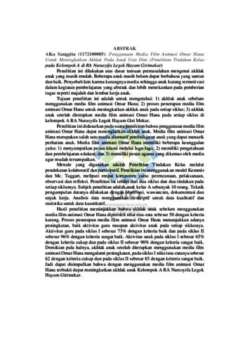 Penggunaan Media Film Animasi Omar Hana Untuk Meningkatkan Akhlak Pada Anak Usia Dini (Penelitian Tindakan Kelas pada Kelompok A di RA Nurusyifa Legok Hayam Girimekar). Penelitian ini dilakukan atas dasar temuan permasalahan mengenai akhlak anak yang masih rendah. Beberapa anak masih belum dapat berbahasa yang santun dan baik. Penyebab lain karena kurangnya media sehingga anak kurang termotivasi dalam kegiatan pembelajaran yang abstrak dan lebih menekankan pada pemberian tugas seperti majalah dan lembar kerja anak. Tujuan penelitian ini adalah untuk mengetahui: 1) akhlak anak sebelum menggunakan media film animasi Omar Hana; 2) proses penerapan media film animasi Omar Hana untuk meningkatkan akhlak anak pada setiap siklus; 3) akhlak anak setelah diterapkan media film animasi Omar Hana pada setiap siklus di kelompok A RA Nurusyifa Legok Hayam Giri Mekar. Penelitian ini didasarkan pada suatu pemikiran bahwa penggunaan media film animasi Omar Hana dapat meningkatkan akhlak anak. Media film animasi Omar Hana merupakan salah satu media alternatif pembelajaran anak yang dapat menarik perhatian anak. Media film animasi Omar Hana memiliki beberapa keunggulan yaitu: 1) menyampaikan pesan islami melalui lagu-lagu; 2) memiliki pengetahuan dan pembelajaran edukasi; dan 3) memiliki pesan agama yang dikemas oleh media agar mudah tersampaikan. Metode yang digunakan adalah Penelitian Tindakan Kelas melalui pendekatan kolaboratif dan partisipatif. Penelitian ini menggunakan model Kemmis dan Mc. Taggart, meliputi empat komponen yaitu: perencanaan, pelaksanaan, observasi dan refleksi. Penelitian ini terdiri dari dua siklus dan dua tindakan pada setiap siklusnya. Subjek penelitian adalah anak kelas A sebanyak 10 orang. Teknik pengumpulan datanya dilakukan dengan observasi, wawancara, dokumentasi dan unjuk kerja. Analisis data menggunakan deskriptif untuk data kualitatif dan statistika untuk data kuantitatif. Hasil penelitian menunjukkan bahwa akhlak anak sebelum menggunakan media film animasi Omar Hana diperoleh nilai rata-rata sebesar 50 dengan kriteria kurang. Proses penerapan media film animasi Omar Hana menunjukkan adanya peningkatan, baik aktivitas guru maupun aktivitas anak pada setiap siklusnya. Aktivitas guru pada siklus I sebesar 73% dengan kriteria baik dan pada siklus II sebesar 96% dengan kriteria sangat baik. Aktivitas anak pada siklus I sebesar 65% dengan kriteria cukup dan pada siklus II sebesar 90% dengan kriteria sangat baik. Demikian pula halnya, akhlak anak setelah diterapkan menggunakan media film animasi Omar Hana mengalami peningkatan, pada siklus I nilai rata-ratanya sebesar 62 dengan kriteria cukup dan pada siklus II sebesar 85 dengan kriteria sangat baik. Jadi dapat disimpulkan bahwa dengan menggunakan media film animasi Omar Hana terbukti dapat meningkatkan akhlak anak Kelompok A RA Nurusyifa Legok Hayam Girimekar.