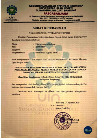 Kosa, Hikmah Akmelia (2025) Sikap siswa terhadap penerapan model direct instruction pada mata pelajaran akidah akhlak hubungannya dengan motivasi belajar dan kesantunan di sekolah: Penelitian korelasional terhadap siswa kelas VIII MTs Al-Hasaniyah Kabupaten Tangerang. Masters thesis, UIN Sunan Gunung Djati Bandung.