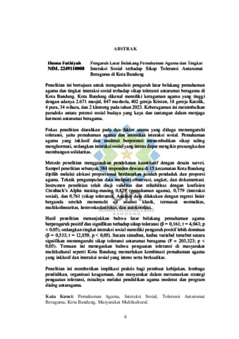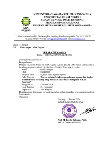 Fathiyah, Husna (2026) Pengaruh latar belakang pemahaman agama dan tingkat interaksi sosial terhadap sikap toleransi antarumat beragama di Kota Bandung. Masters thesis, UIN Sunan Gunung Djati Bandung.