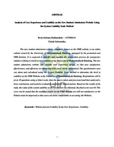 INDONESIA: The new student admissions website, commonly known as the PMB website, is an online website owned by the University of Muhammadiyah Bandung, managed by the promotion and PMB division. It is expected to simplify and expedite the registration process for prospective students wishing to enroll as new students at the University of Muhammadiyah Bandung. The new student admissions website can consider user experience design, so that user satisfaction, effectiveness, and efficiency in interacting with users can be determined. The questionnaire used was taken and calculated using the System Usability Scale method to determine the level of usability on the PMB Website at the University of Muhammadiyah Bandung. Respondents will be given 10 questions using a Likert scale, then the data is taken and processed and then analyzed to draw conclusions, and used for evaluation material by related parties. Based on the results of the study, the value of the system usability scale calculation was obtained, the final score was 64. This score can be stated that the usability results on the PMB Website are still not satisfactory so the Website must be improved so that users are more comfortable in accessing the Website ENGLISH: Website penerimaan mahasiswa baru atau biasa disebut website PMB adalah website online yang dimiliki oleh Universitas Muhammadiyah Bandung yang di kelola oleh bagian promosi dan pmb yang di harapkan dapat mempermudah dan mempercepat kinerja dalam hal pendaftaran bagi calon mahasiswa yang ingin mendaftar sebagai mahasiswa baru Universitas Muhammadiyah Bandung. Website penerimaan mahasiswa baru dapat mempertimbangan desain User Experience, agar dapat di ketahui kepuasan, tingkat efektifitas dan efisiensi pengguna dalam berinteraksi. Kuisoner yang digunakan diambil dan di hitung dengan menggunakan metode System Usability Scale untuk mengetahui tingat usability pada Website PMB di Universitas Muhammadiyah Bandung. Responden akan di berikan 10 pertanyaan dengan mengunakan skala likert yang kemudian data tersebut ambil dan di olah kemudian di analisis untuk di ambil kesimpulan, serta di gunakan untuk bahan evaluasi oleh pihak terkait. Berdasarkan hasil penelitian didapatkan nilai dari perhitungan system usability scale, skor akhir mendapatkan nilai 64. Skor tersebut dapat dinyatakan hasil usability pada Website PMB masih belum memenuhi sehingga Website harus diperbaiki agar user lebih nyaman dalam mengakses Website.