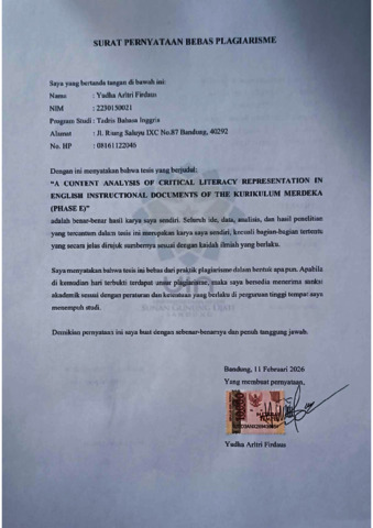 Firdaus, Yudha Arltri (2026) A content analysis of critical literacy representation in english instructional documents of the Kurikulum Merdeka (Phase e). Masters thesis, UIN Sunan Gunung Djati Bandung.