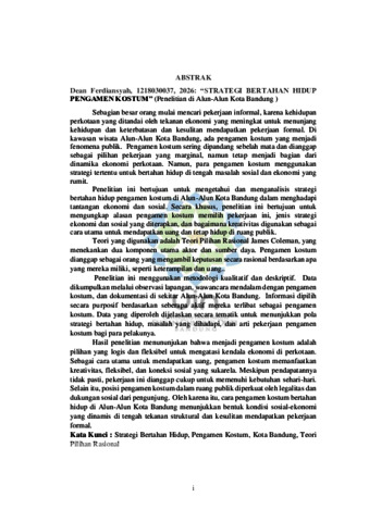 Sebagian besar orang mulai mencari pekerjaan informal, karena kehidupan perkotaan yang ditandai oleh tekanan ekonomi yang meningkat untuk menunjang kehidupan dan keterbatasan dan kesulitan mendapatkan pekerjaan formal. Di kawasan wisata Alun-Alun Kota Bandung, ada pengamen kostum yang menjadi fenomena publik. Pengamen kostum sering dipandang sebelah mata dan dianggap sebagai pilihan pekerjaan yang marginal, namun tetap menjadi bagian dari dinamika ekonomi perkotaan. Namun, para pengamen kostum menggunakan strategi tertentu untuk bertahan hidup di tengah masalah sosial dan ekonomi yang rumit. Penelitian ini bertujuan untuk mengetahui dan menganalisis strategi bertahan hidup pengamen kostum di Alun-Alun Kota Bandung dalam menghadapi tantangan ekonomi dan sosial. Secara khusus, penelitian ini bertujuan untuk mengungkap alasan pengamen kostum memilih pekerjaan ini, jenis strategi ekonomi dan sosial yang diterapkan, dan bagaimana kreativitas digunakan sebagai cara utama untuk mendapatkan uang dan tetap hidup di ruang publik. Teori yang digunakan adalah Teori Pilihan Rasional James Coleman, yang menekankan dua komponen utama aktor dan sumber daya. Pengamen kostum dianggap sebagai orang yang mengambil keputusan secara rasional berdasarkan apa yang mereka miliki, seperti keterampilan dan uang.. Penelitian ini menggunakan metodologi kualitatif dan deskriptif. Data dikumpulkan melalui observasi lapangan, wawancara mendalam dengan pengamen kostum, dan dokumentasi di sekitar Alun-Alun Kota Bandung. Informasi dipilih secara purposif berdasarkan seberapa aktif mereka terlibat sebagai pengamen kostum. Data yang diperoleh dijelaskan secara tematik untuk menunjukkan pola strategi bertahan hidup, masalah yang dihadapi, dan arti pekerjaan pengamen kostum bagi para pelakunya. Hasil penelitian menununjukan bahwa menjadi pengamen kostum adalah pilihan yang logis dan fleksibel untuk mengatasi kendala ekonomi di perkotaan. Sebagai cara utama untuk mendapatkan uang, pengamen kostum memanfaatkan kreativitas, fleksibel, dan koneksi sosial yang sukarela. Meskipun pendapatannya tidak pasti, pekerjaan ini dianggap cukup untuk memenuhi kebutuhan sehari-hari. Selain itu, posisi pengamen kostum dalam ruang publik diperkuat oleh legalitas dan dukungan sosial dari pengunjung. Oleh karena itu, cara pengamen kostum bertahan hidup di Alun-Alun Kota Bandung menunjukkan bentuk kondisi sosial-ekonomi yang dinamis di tengah tekanan struktural dan kesulitan mendapatkan pekerjaan formal.