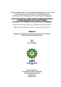 Persaingan antar lembaga pendidikan menuntut peningkatan mutu layanan sebagai strategi utama pemasaran. Mutu layanan yang baik tidak hanya membangun citra positif lembaga, tetapi juga mendorong kepuasan dan minat calon peserta didik. Melalui perbaikan berkelanjutan yang melibatkan seluruh unsur sumber daya manusia, lembaga pendidikan diharapkan mampu bertransformasi menjadi institusi yang adaptif, profesional, dan berdaya saing tinggi. Tujuan penelitian ini adalah untuk mengidentifikasi: 1) Strategi pemasaran jasa pendidikan dalam menarik dan meningkatkan minat calon peserta didik, 2) Mutu layanan pendidikan berdasarkan lima dimensi utama, yaitu tangible (berwujud), reliability (keandalan), responsiveness (daya tanggap), assurance (jaminan), dan empathy (empati), 3) Keterkaitan antara strategi pemasaran berbasis mutu layanan dengan peningkatan minat calon peserta didik, 4) Kendala yang dihadapi dalam mengoptimalkan strategi pemasaran jasa pendidikan berbasis mutu layanan, serta menemukan alternatif solusi untuk mengatasinya di MTs Al Hidayah dan MTs Daarul Uluum PUI. Kerangka berpikir penelitian ini menegaskan bahwa peningkatan mutu layanan merupakan inti strategi pemasaran madrasah. Dengan memadukan prinsip service marketing dan quality management, mutu layanan yang unggul akan membentuk citra positif, meningkatkan kepercayaan, serta kepuasan peserta didik dan orang tua. Pendekatan ini sejalan dengan nilai ihsan dalam Islam, menjadikan mutu layanan tidak hanya bernilai manajerial tetapi juga spiritual, guna memperkuat daya saing dan keberlanjutan lembaga pendidikan Islam di era disrupsi. Penelitian ini menggunakan pendekatan kualitatif dengan metode studi kasus. Teknik pengambilan data dilakukan melalui wawancara, observasi dan analisis dokumentasi. Adapun teknik analisis data menggunakan model interaktif Miles, Huberman, dan Saldaña. Sedangkan uji keabsahan dilakukan dengan melakukan uji; credibility, transferability, dependability, dan confirmability. Penelitian ini menemukan bahwa: 1) Strategi pemasaran jasa pendidikan Islam yang efektif berakar pada integrasi nilai keislaman dan mutu layanan sebagai dasar pembentukan citra positif Lembaga; 2) Mutu layanan pendidikan di MTs Al Hidayah dilakukan dengan pendekatan humanistik berbasis empati dan fleksibilitas layanan, sedangkan MTs Daarul Uluum PUI unggul melalui sistem manajemen mutu yang terstruktur dan institusional; 3) Keterkaitan strategi pemasaran berbasis mutu di kedua madrasah, yaitu dengan menonjolkan pendekatan humanistik berbasis empati dan menekankan sistem manajemen mutu; 4) Kendala utama meliputi kurangnya sistemisasi mutu, dokumentasi, dan inovasi promosi digital, yang berdampak pada terbatasnya jangkauan dan profesionalitas pemasaran. Solusi strategis meliputi penguatan manajemen mutu berbasis data, peningkatan kapasitas SDM, kemitraan masyarakat, serta optimalisasi komunikasi digital untuk menciptakan pemasaran pendidikan Islam yang berkelanjutan dan bernilai dakwah.