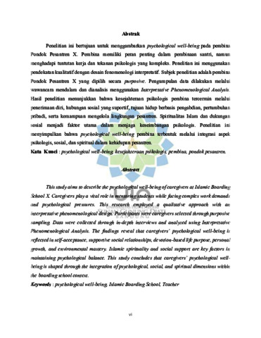 INDONESIA : Penelitian ini bertujuan untuk menggambarkan psychological well-being pada pembina Pondok Pesantren X. Pembina memiliki peran penting dalam pembinaan santri, namun menghadapi tuntutan kerja dan tekanan psikologis yang kompleks. Penelitian ini menggunakan pendekatan kualitatif dengan desain fenomenologi interpretatif. Subjek penelitian adalah pembina Pondok Pesantren X yang dipilih secara purposive. Pengumpulan data dilakukan melalui wawancara mendalam dan dianalisis menggunakan Interpretative Phenomenological Analysis. Hasil penelitian menunjukkan bahwa kesejahteraan psikologis pembina tercermin melalui penerimaan diri, hubungan sosial yang suportif, tujuan hidup berbasis pengabdian, pertumbuhan pribadi, serta kemampuan mengelola lingkungan pesantren. Spiritualitas Islam dan dukungan sosial menjadi faktor utama dalam menjaga keseimbangan psikologis. Penelitian ini menyimpulkan bahwa psychological well-being pembina terbentuk melalui integrasi aspek psikologis, sosial, dan spiritual dalam kehidupan pesantren. INGGRIS: This study aims to describe the psychological well-being of caregivers at Islamic Boarding School X. Caregivers play a vital role in mentoring students while facing complex work demands and psychological pressures. This research employed a qualitative approach with an interpretative phenomenological design. Participants were caregivers selected through purposive sampling. Data were collected through in-depth interviews and analyzed using Interpretative Phenomenological Analysis. The findings reveal that caregivers’ psychological well-being is reflected in self-acceptance, supportive social relationships, devotion-based life purpose, personal growth, and environmental mastery. Islamic spirituality and social support are key factors in maintaining psychological balance. This study concludes that caregivers’ psychological well being is shaped through the integration of psychological, social, and spiritual dimensions within the boarding school context.