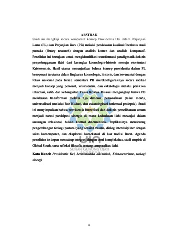 Studi ini mengkaji secara komparatif konsep Providentia Dei dalam Perjanjian Lama (PL) dan Perjanjian Baru (PB) melalui pendekatan kualitatif berbasis studi pustaka (library research) dengan analisis konten dan analisis komparatif. Penelitian ini bertujuan untuk mengidentifikasi transformasi paradigmatik doktrin penyelenggaraan ilahi dari kerangka kosmologis-historis menuju reorientasi Kristosentris. Hasil utama menunjukkan bahwa konsep providentia dalam PL beroperasi terutama dalam lingkaran kosmologis, historis, dan kovenantal dengan fokus nasional pada Israel, sementara PB merekonfigurasinya secara radikal menjadi konsep yang personal, kristosentris, dan eskatologis melalui peristiwa inkarnasi, salib, dan kebangkitan Yesus Kristus. Diskusi mengungkap bahwa PB melakukan transformasi melalui tiga dimensi: personalisasi (relasi menō), universalisasi (melalui Roh Kudus), dan eskatologisasi (orientasi proleptik). Studi ini menyimpulkan bahwa providentia berevolusi dari doktrin pemeliharaan umum menjadi narasi partisipasi sinergis di mana kedaulatan ilahi mewujud dalam undangan relasional, bukan kontrol deterministik. Implikasinya mendorong pengembangan teologi pastoral yang sensitif trauma, dialog interdisipliner dengan sains kontemporer, dan eksplorasi kontekstual di luar tradisi Barat. Agenda penelitian ke depan mencakup integrasi dengan teori kompleksitas, studi empiris di Global South, serta refleksi filosofis tentang temporalitas ilahi.