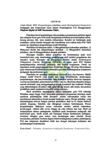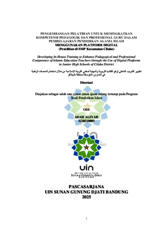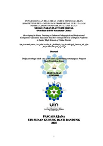 BAHASA INDONESIA : Penelitian ini di latarbelakangi oleh rendahnya pemanfaatan platform digital dan sebagian besar guru PAI masih menghadapi keterbatasan keterampilan teknis, kurang percaya diri, serta kendala infrastruktur. Kondisi ini berdampak pada rendahnya variasi metode mengajar dan keterlibatan siswa dalam kelas PAI. Oleh karena itu, diperlukan pengembangan model Pelatihan. Penelitian ini bertujuan untuk: 1) Mengidentifikasi kebutuhan pelatihan ; 2) Menyusun desain dan pengembangan pelatihan ; 3) Menganalisis diseminasi pelatihan ; dan 4) Menggambarkan dampak pelatihan . Kerangka berpikir dalam penelitian ini berlandaskan pada teori konstruktivisme yang menekankan pembelajaran aktif melalui pengalaman dan interaksi sosial. Kerangka ini diwujudkan melalui model Technological Pedagogical Content Knowledge (TPACK), di mana guru PAI dituntut mengintegrasikan teknologi, pedagogi, dan konten keagamaan. Untuk itu digunakan model pengembangan Four-D (Define, Design, Develop, Disseminate) guna merancang Pelatihan secara sistematis agar efektif meningkatkan kompetensi pedagogik dan profesional guru. Penelitian ini memakai pendekatan Research and Development (R&D) dengan model Four-D yang terdiri atas tahap pendefinisian, perancangan, pengembangan, dan penyebarluasan. Data diperoleh melalui observasi lapangan, wawancara mendalam, penyebaran kuesioner, serta tes. Hasil data dianalisis dengan metode deskriptif yang menggabungkan teknik kuantitatif dan kualitatif. Produk yang dikembangkan divalidasi oleh pakar bidang materi, ahli media, dan praktisi pendidikan untuk menjamin kelayakan penggunaannya. Hasil penelitian menunjukkan bahwa kebutuhan guru PAI terhadap Pelatihan sangat tinggi. Guru menyadari pentingnya penguasaan teknologi untuk membuat pembelajaran lebih interaktif, namun keterampilan teknis dan keterbatasan infrastruktur masih menjadi hambatan utama. Desain pelatihan yang dikembangkan relevan dengan tuntutan pendidikan abad ke-21 karena berbasis praktik langsung, fleksibel, dan dilengkapi evaluasi berkelanjutan. Proses pengembangan dilakukan secara sistematis melalui analisis kebutuhan, perancangan, validasi ahli, revisi, hingga uji coba terbatas dan luas. Hasil uji menunjukkan adanya peningkatan signifikan pada kompetensi pedagogik dan profesional guru, meski masih ada tantangan berupa keterbatasan perangkat, resistensi sebagian guru senior, serta kesenjangan antar sekolah. Secara keseluruhan, pelatihan berbasis digital efektif meningkatkan kualitas pembelajaran PAI dan berpotensi direplikasi lebih luas dengan dukungan kebijakan dan pendampingan berkelanjutan. ENGLISH : This study was motivated by the limited use of digital platforms in teaching Islamic Religious Education (PAI) at junior high schools in Cilaku District. Most PAI teachers still face technical skill gaps, lack of confidence, and infrastructure barriers in integrating technology into classroom practice. These challenges have led to low variation in teaching methods and limited student engagement. Therefore, it is necessary to develop a digital-based In-House Training model aimed at improving teachers’ pedagogical and professional competence. The objectives of this research were: (1) to identify the needs for pelatihan ; (2) to design and develop a digital-based pelatihan model; (3) to analyze the dissemination of the training; and (4) to describe its impact on teacher competence. The conceptual framework draws on constructivist theory, which emphasizes active learning through experience and social interaction, operationalized through the Technological Pedagogical Content Knowledge (TPACK) framework. To ensure systematic development, the Four-D model (Define, Design, Develop, Disseminate) was employed. This study applied a Research and Development (R&D) approach with data collected through observation, interviews, questionnaires, and tests, analyzed using descriptive quantitative and qualitative techniques. Validation was conducted by subject matter experts, media specialists, and educational practitioners. The findings indicate that teachers’ need for digital-based pelatihan is very high. Teachers recognize the importance of mastering technology to create more interactive learning, but technical limitations and inadequate infrastructure remain major challenges. The developed pelatihan model is relevant to the demands of 21st-century education as it emphasizes hands-on practice, flexibility, and continuous evaluation. The development process was carried out systematically, from needs analysis and design to expert validation, revision, and both limited and wider trials. The trials showed significant improvements in teachers’ pedagogical and professional competence, although challenges such as limited devices, resistance among some senior teachers, and school-level disparities persist. Overall, the digital-based pelatihan proved effective in enhancing the quality of PAI instruction and holds strong potential for wider implementation with adequate policy support and sustained mentoring. ARABIC : عده علياه. ٢٠٢٥. تطوير برنامج التدريب الداخلي لتعزيز الكفاءة البيداغوجية والمهنية لمعلمي التربية الإسلامية باستخدام المنصات الرقمية في المدارس المتوسطة بمنطقة تشيلاكو تنطلق هذه الدراسة من محدودية استخدام المنصات الرقمية في تدريس مادة التربية الإسلامية في المدارس المتوسطة بمنطقة تشيلاكو. فما زال معظم معلمي التربية الإسلامية يواجهون ضعفاً في المهارات التقنية، ونقصاً في الثقة بالنفس، وصعوبات في البنية التحتية عند دمج التكنولوجيا في الممارسات الصفية. وقد أدى ذلك إلى قلة تنويع أساليب التدريس وضعف تفاعل الطلا