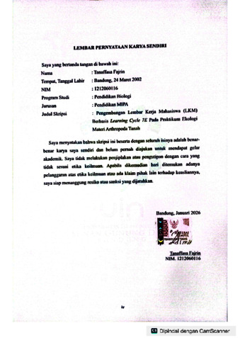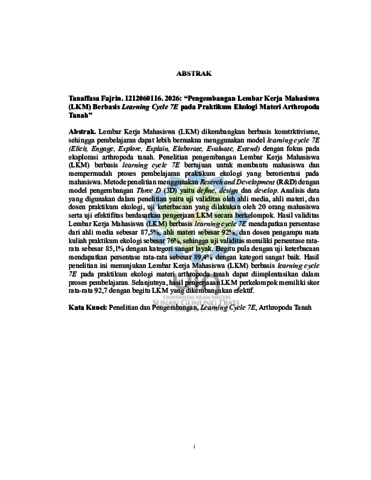 Fajrin, Tanaffasa (2026) Pengembangan Lembar Kerja Mahasiswa (LKM) berbasis learning cycle 7E pada praktikum ekologi materi arthropoda tanah. Sarjana thesis, UIN Sunan Gunung Djati Bandung.