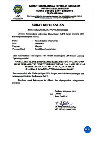 Khoerunnisa, Ananda Salma (2025) Pengaruh model Cooperative Learning tipe Two Stay Two Stray Berbasis Flip Chart terhadap minat dan hasil belajar peserta didik pada mata pelajaran Fikih: Penelitian di kelas X MA YPI Baiturrahman Garut. Masters thesis, UIN Sunan Gunung Djati Bandung.