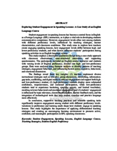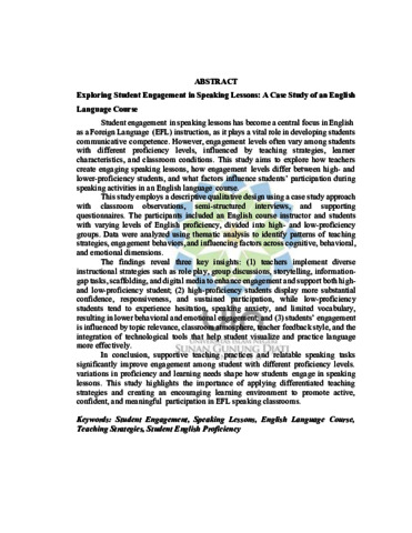 Student engagement in speaking lessons has become a central focus in English as a Foreign Language (EFL) instruction, as it plays a vital role in developing students communicative competence. However, engagement levels often vary among students with different proficiency levels, influenced by teaching strategies, learner characteristics, and classroom conditions. This study aims to explore how teachers create engaging speaking lessons, how engagement levels differ between high- and lower-proficiency students, and what factors influence students’ participation during speaking activities in an English language course. This study employs a descriptive qualitative design using a case study approach with classroom observations, semi-structured interviews, and supporting questionnaires. The participants included an English course instructor and students with varying levels of English proficiency, divided into high- and low-proficiency groups. Data were analyzed using thematic analysis to identify patterns of teaching strategies, engagement behaviors, and influencing factors across cognitive, behavioral, and emotional dimensions. The findings reveal three key insights: (1) teachers implement diverse instructional strategies such as role play, group discussions, storytelling, information-gap tasks, scaffolding, and digital media to enhance engagement and support both high- and low-proficiency student; (2) high-proficiency students display more substantial confidence, responsiveness, and sustained participation, while low-proficiency students tend to experience hesitation, speaking anxiety, and limited vocabulary, resulting in lower behavioral and emotional engagement; and (3) students’ engagement is influenced by topic relevance, classroom atmosphere, teacher feedback style, and the integration of technological tools that help student visualize and practice language more effectively. In conclusion, supportive teaching practices and relatable speaking tasks significantly improve engagement among student with different proficiency levels. variations in proficiency and learning needs shape how students engage in speaking lessons. This study highlights the importance of applying differentiated teaching strategies and creating an encouraging learning environment to promote active, confident, and meaningful participation in EFL speaking classrooms.