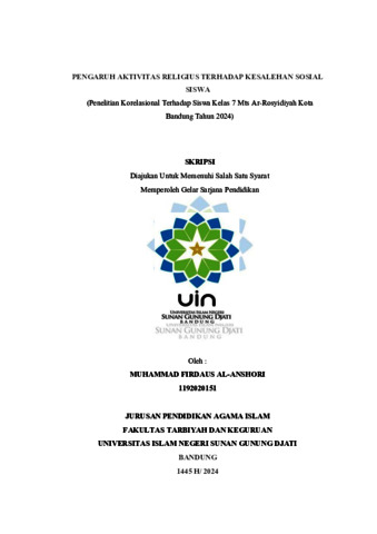 Al-Aanshori, Muuhammad Firdaus (2026) Pengaruh aktivitas religius terhadap kesalehan sosial siswa; Penelitian korelasional terhadap siswa kelas 7 Mts Ar-Rosyidiyah Kota Bandung tahun 2024. Sarjana thesis, UIN Sunan Gunun Djati Bandung.