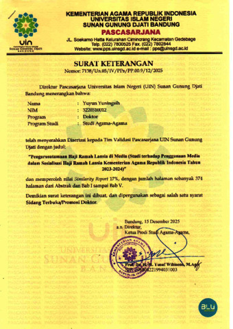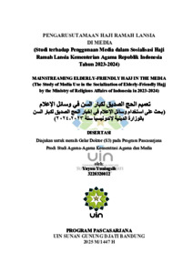 Yuningsih, Yuyun (2026) Pengarusutamaan haji ramah lansia di media: Studi terhadap penggunaan media dalam sosialisasi haji ramah lansia Kementerian Agama Republik Indonesia tahun 2023-2024. Doktoral thesis, UIN Sunan Gunung Djati Bandung.