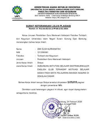 Nurhanifah, Izmi Elsa (2026) Hubungan aktivitas belajar ekstrakurikuler English Club terhadap motivasi belajar siswa pada mata pelajaran bahasa Inggris di sekolah dasar. Sarjana thesis, UIN Sunan Gunung Djati Bandung.