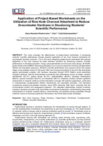 ENGLISH: This study evaluates the effectiveness of project-based worksheets in developing students' scientific performance through practical application of rice husk charcoal adsorbents for groundwater hardness reduction. This is first study integrating project-based worksheets with practical application of rice husk charcoal for water hardness reduction for develoving students’ scientific performance in chemistry education. Using a pre-experimental one-shot case study design, 36 twelfthgrade students from SMKN 7 Bandung participated in a six-session practicum involving complexometric titration and adsorption processes. Students' scientific performance was assessed across five project stages using validated rubrics (0-100 scale). Rice husk charcoal adsorbents (0.2g and 0.5g) were tested against groundwater samples, with hardness measured through EDTA titration using established analytical protocols. Results demonstrated consistently high performance across all stages: problem identification (92.1%), project design (91.3%), implementation (89.8%), prototype development (89.8%), product evaluation (95.6%), and finalization (86.7%). Statistical analysis showed significant improvement in students' ability to connect theoretical concepts with practical applications, particularly in understanding complexometric titration mechanisms and adsorption principles. The adsorbent successfully reduced groundwater hardness below WHO standards (500 mg/L), validating both the environmental solution and pedagogical approach. This integrated methodology uniquely combines analytical chemistry education with sustainable environmental remediation, demonstrating measurable enhancement in students' scientific literacy, critical thinking, and problem-solving capabilities through authentic, hands-on learning experiences that address real-world water quality challenges. INDONESIA: Penelitian ini mendeskripsikan efektivitas lembar kerja berbasis proyek dalam mengembangkan kinerja ilmiah siswa melalui penerapan praktikum adsorben arang sekam padi untuk menurunkan kesadahan air tanah. Penelitian ini merupakan penelitian yang mengintegrasikan lembar kerja berbasis proyek dengan aplikasi praktikum arang sekam padi untuk menurunkan kesadahan air untuk mengembangkan kinerja ilmiah siswa dalam pendidikan kimia. Dengan menggunakan pra-experimental dengan desain one-shot case study, 36 siswa kelas dua belas dari SMKN 7 Bandung berpartisipasi dalam praktikum enam pertemuan meliputi titrasi kompleksometri dan proses adsorpsi. Data kuantitatif dikumpulkan dengan menggunakan instrumen penilaian lembar kerja berbasis proyek. Kinerja ilmiah siswa dinilai dalam lima tahap proyek dengan menggunakan rubrik yang telah divalidasi (skala 0-100). Adsorben arang sekam padi (0,2 g dan 0,5 g) diuji terhadap sampel air tanah, dengan kesadahan diukur melalui titrasi kompleksometri menggunakan prosedur analisis yang telah ditetapkan. Hasilnya menunjukkan kinerja yang tinggi secara konsisten di semua tahap: identifikasi masalah (92,1%), desain proyek (91,3%), melaksanaan proyek (89,8%), menyusun prototype (89,8%), (95,6%), dan finalisasi (86,7%). Analisis menunjukkan pengembangan yang signifikan dalam kemampuan siswa untuk menghubungkan konsep teoritis dengan aplikasi praktis, terutama dalam memahami mekanisme titrasi kompleksometri dan prinsip-prinsip adsorpsi. Adsorben ini berhasil menurunkan kesadahan air tanah di bawah standar WHO (500 mg/L), membuktikan bahwa solusi lingkungan dan pendekatan pedagogisnya berhasil. Metodologi ini menggabungkan pendidikan kimia analitik dengan remediasi lingkungan yang berkelanjutan, yang menunjukkan peningkatan terukur dalam kinerja ilmiah, pemikiran kritis, dan kemampuan pemecahan masalah siswa melalui pengalaman belajar secara langsung untuk mengatasi tantangan kualitas air di dunia nyata.