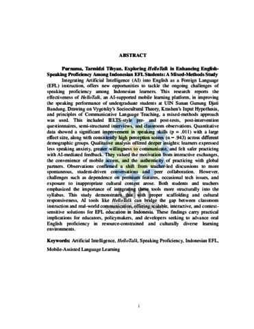 Purnama, Tarmidzi Tibyan (2026) Exploring Hellotalk in enhancing english-speaking proficiency among Indonesian EFL students: A mixed-methods study. Masters thesis, UIN Sunan Gunung Djati Bandung.