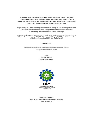 Nasrullah, Nasrullah (2026) Politik hukum pecegahan perkawinan anak: Kajian terhadap Undang-Undang perkawinan dan Peraturan Daerah Provinsi Nusa tenggara barat nomor 5 tahun 2021 tentang pencegahan perkawinan anak. Doktoral thesis, UIN Sunan Gunung Djati Bandung.