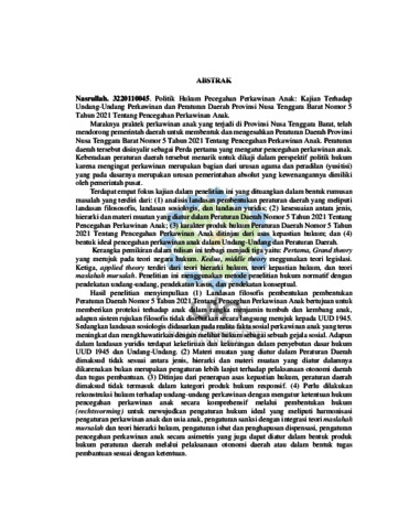 Nasrullah. 3220110045. Politik Hukum Pecegahan Perkawinan Anak: Kajian Terhadap Undang-Undang Perkawinan dan Peraturan Daerah Provinsi Nusa Tenggara Barat Nomor 5 Tahun 2021 Tentang Pencegahan PerkawinanMaraknya praktek perkawinan anak yang terjadi di Provinsi Nusa Tenggara Barat, telah mendorong pemerintah daerah untuk membentuk dan mengesahkan Peraturan Daerah Provinsi Nusa Tenggara Barat Nomor 5 Tahun 2021 Tentang Pencegahan Perkawinan Anak. Peraturan daerah tersebut disinyalir sebagai Perda pertama yang mengatur pencegahan perkawinan anak. Keberadaan peraturan daerah tersebut menarik untuk dikaji dalam perspektif politik hukum karena mengingat perkawinan merupakan bagian dari urusan agama dan peradilan (yusitisi) yang pada dasarnya merupakan urusan pemerintahan absolut yang kewenangannya dimiliki oleh pemerintah pusat. Terdapat empat fokus kajian dalam penelitian ini yang dituangkan dalam bentuk rumusan masalah yang terdiri dari: (1) analisis landasan pembentukan peraturan daerah yang meliputi landasan filososofis, landasan sosiologis, dan landasan yuridis; (2) kesesuaian antara jenis, hierarki dan materi muatan yang diatur dalam Peraturan Daerah Nomor 5 Tahun 2021 Tentang Pencegahan Perkawinan Anak; (3) karakter produk hukum Peraturan Daerah Nomor 5 Tahun 2021 Tentang Pencegahan Perkawinan Anak ditinjau dari asas kepastian hukum; dan (4) bentuk ideal pencegahan perkawinan anak dalam Undang-Undang dan Peraturan Daerah. Kerangka pemikiran dalam tulisan ini terbagi menjadi tiga yaitu: Pertama, Grand theory yang merujuk pada teori negara hukum. Kedua, middle theory meggunakan teori legislasi. Ketiga, applied theory terdiri dari teori hierarki hukum, teori kepastian hukum, dan teori maslahah mursalah. Penelitian ini menggunakan metode penelitian hukum normatif dengan pendekatan undang-undang, pendekatan kasus, dan pendekatan konseptual. Hasil penelitian menyimpulkan (1) Landasan filosofis pembentukan pembentukan Peraturan Daerah Nomor 5 Tahun 2021 Tentang Penceghan Perkawinan Anak bertujuan untuk memberikan proteksi terhadap anak dalam rangka menjamin tumbuh dan kembang anak, adapun sistem rujukan filosofis tidak disebutkan secara langsung merujuk kepada UUD 1945. Sedangkan landasan sosiologis didasarkan pada realita fakta sosial perkawinan anak yang terus meningkat dan mengkhawatirkan dengan melihat hukum sebagai sebuah gejala sosial. Adapun dalam landasan yuridis terdapat kekeliruan dan kekurangan dalam penyebutan dasar hukum UUD 1945 dan Undang-Undang. (2) Materi muatan yang diatur dalam Peraturan Daerah dimaksud tidak sesuai antara jenis, hierarki dan materi muatan yang diatur dalamnya dikarenakan bukan merupakan pengaturan lebih lanjut terhadap pelaksanaan otonomi daerah dan tugas pembantuan. (3) Ditinjau dari penerapan asas kepastian hukum, peraturan daerah dimaksud tidak termasuk dalam kategori produk hukum responsif. (4) Perlu dilakukan rekonstruksi hukum terhadap undang-undang perkawinan dengan mengatur ketentuan hukum pencegahan perkawinan anak secara komprehensif melalui pembentukan hukum (rechtsvorming) untuk mewujudkan pengaturan hukum ideal yang meliputi harmonisasi pengaturan perkawinan anak dan usia anak, pengaturan sanksi dengan integrasi teori maslahah mursalah dan teori hierarki hukum, pengaturan isbat dan penghapusan dispensasi, pengaturan pencegahan perkawinan anak secara asimetris yang juga dapat diatur dalam bentuk produk hukum peraturan daerah melalui pelaksanaan otonomi daerah atau dalam bentuk tugas pembantuan sesuai dengan ketentuan. Anak. Maraknya praktek perkawinan anak yang terjadi di Provinsi Nusa Tenggara Barat, telah mendorong pemerintah daerah untuk membentuk dan mengesahkan Peraturan Daerah Provinsi Nusa Tenggara Barat Nomor 5 Tahun 2021 Tentang Pencegahan Perkawinan Anak. Peraturan daerah tersebut disinyalir sebagai Perda pertama yang mengatur pencegahan perkawinan anak. Keberadaan peraturan daerah tersebut menarik untuk dikaji dalam perspektif politik hukum karena mengingat perkawinan merupakan bagian dari urusan agama dan peradilan (yusitisi) yang pada dasarnya merupakan urusan pemerintahan absolut yang kewenangannya dimiliki oleh pemerintah pusat. Terdapat empat fokus kajian dalam penelitian ini yang dituangkan dalam bentuk rumusan masalah yang terdiri dari: (1) analisis landasan pembentukan peraturan daerah yang meliputi landasan filososofis, landasan sosiologis, dan landasan yuridis; (2) kesesuaian antara jenis, hierarki dan materi muatan yang diatur dalam Peraturan Daerah Nomor 5 Tahun 2021 Tentang Pencegahan Perkawinan Anak; (3) karakter produk hukum Peraturan Daerah Nomor 5 Tahun 2021 Tentang Pencegahan Perkawinan Anak ditinjau dari asas kepastian hukum; dan (4) bentuk ideal pencegahan perkawinan anak dalam Undang-Undang dan Peraturan Daerah. Kerangka pemikiran dalam tulisan ini terbagi menjadi tiga yaitu: Pertama, Grand theory yang merujuk pada teori negara hukum. Kedua, middle theory meggunakan teori legislasi. Ketiga, applied theory terdiri dari teori hierarki hukum, teori kepastian hukum, dan teori maslahah mursalah. Penelitian ini menggunakan metode penelitian hukum normatif dengan pendekatan undang-undang, pendekatan kasus, dan pendekatan konseptual. Hasil penelitian menyimpulkan (1) Landasan filosofis pembentukan pembentukan Peraturan Daerah Nomor 5 Tahun 2021 Tentang Penceghan Perkawinan Anak bertujuan untuk memberikan proteksi terhadap anak dalam rangka menjamin tumbuh dan kembang anak, adapun sistem rujukan filosofis tidak disebutkan secara langsung merujuk kepada UUD 1945. Sedangkan landasan sosiologis didasarkan pada realita fakta sosial perkawinan anak yang terus meningkat dan mengkhawatirkan dengan melihat hukum sebagai sebuah gejala sosial. Adapun dalam landasan yuridis terdapat kekeliruan dan kekurangan dalam penyebutan dasar hukum UUD 1945 dan Undang-Undang. (2) Materi muatan yang diatur dalam Peraturan Daerah dimaksud tidak sesuai antara jenis, hierarki dan materi muatan yang diatur dalamnya dikarenakan bukan merupakan pengatu