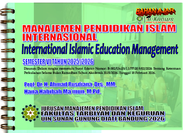 Bahan ajar merupakan bagian penting dalam mendukukung optimalisasi pembelajaran, telebih dalam suasana pembelajaran saat ini menuntut media pendukung yang memadai untuk digunakan sesuai dengan porsi pembelajaran yang baik dan tepat.Regulasi menuntut dosen untuk menyiapkan bahan ajar, pada setiap pembelajaran. Penggunaan bahan ajar dalam pembelajaran memiliki beberapa fungsi diantarany: (1) membantu peserta didik agar tidak perlu mencatat; (2) sebagai pendamping penjelasan pendidik; (3) sebagai bahan rujukan pesertadidik (4) memotivasi peserta didik agar lebih giat belajar; (5) pengingat pokok-pokok materi yang diajarkan; (6) memberi umpan balik; dan (7) menilai hasil belajar. Adapun, tujuan penyusunan handout ini, antara lain: (1) untuk memperlancar dan memberikan bantuan informasi atau materi pembelajaran sebagai pegangan bagi peserta didik; (2) untuk memperkaya pengetahuan peserta didik; dan (3) untuk mendukung bahan ajar lainnya atau penjelasan dari dosen (4) Sebagai materi dalam intruksi Google class room dan LMS berbasis e-Knows UIN SGD Bandung. Disusun berdasarkan Surat Edaran Nomor: B-582/Un.05/I.1/PP.00.9/02/2026 Tentang Ketentuan Perkuliahan Selama Bulan Ramadhan Tahun Akademik 2025/2026,Tanggal 18 Februari 2026 Atas dasar itu, maka bahan ajar ini, berisi point-point penting dari materi pelajaran yang akan dipelajari sesuai RPS, antara lain; (1) Wawasan Manajemen Pendidikan Global/Internasional: (2) Beberapa pandangan/Faham tentang Manajemen dan Pendidikan Islam: (3) Berbagai pendekatan dalam Manajemen Pendidikan: (4) Kernagka Konsep Ilmu Manajemen, Pendidikan Global/ Internasional; (5) Pengembangan Konsep Manajemen Pendidikan Islam Berwawasan Global; (6) Fungsi-fungsi dasar Manajemen Pendidikan Islam Global; (7) Manajemen Lembaga Pendidikan Islam; (8) Manajemen Kepemimpinan Pendidikan Islam; (9) Bidang Garapan Manajemen Komponen Dasar Pendidikan Islam Global; (10) Bidang Garapan Manajemen Komponen Penyempurna Pendidikan Islam Global; (11) Manajemen Inovasi Pendidikan Islam Global Berorientasi Pada Mutu; (12)Kebijakan Manajemen Pengembangan Lembaga Pendidikan Islam Internasional dan (13) Analisis Kebijakan dalam Pengembangan Pendidikan Islam berwawasan Global..