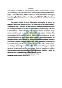 This research examines the power of language as represented in the narrative and dialogues of Babel: Or the Necessity of Violence: An Arcane History of the Oxford Translators’ Revolution (2022) by R. F. Kuang. The study focuses on how language functions as a power and how it impacts a nation and its culture as a representation of power. Language in the novel is portrayed not as a neutral medium, but as an instrument of power that operates through discourse, translation, and the production of knowledge within imperial institutions. This research applies Michel Foucault’s theory of discourse and power relations as the main theoretical framework. The method used is qualitative research with a mimetic approach, and the research design is literary criticism. The findings show that language in Babel functions as a mechanism of Imperial control that shapes identity, culture, and national consciousness. At the same time, language also becomes a medium of resistance that enables critical awareness and challenges dominant power structures. This dual function of language is explicitly represented through narrative conflicts and dialogues that reveal unequal power relations between institutions and marginalized subjects. Thus, language is revealed as a central and paradoxical force in constructing and contesting power in the novel.