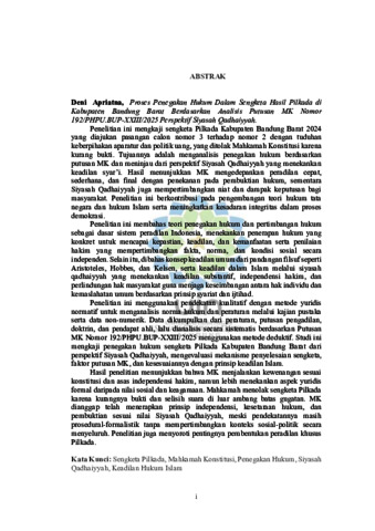 Penelitian ini mengkaji sengketa Pilkada Kabupaten Bandung Barat 2024 yang diajukan pasangan calon nomor 3 terhadap nomor 2 dengan tuduhan keberpihakan aparatur dan politik uang, yang ditolak Mahkamah Konstitusi karena kurang bukti. Tujuannya adalah menganalisis penegakan hukum berdasarkan putusan MK dan meninjau dari perspektif Siyasah Qadhaiyyah yang menekankan keadilan syar’i. Hasil menunjukkan MK mengedepankan peradilan cepat, sederhana, dan final dengan penekanan pada pembuktian hukum, sementara Siyasah Qadhaiyyah juga mempertimbangkan niat dan dampak keputusan bagi masyarakat. Penelitian ini berkontribusi pada pengembangan teori hukum tata negara dan hukum Islam serta meningkatkan kesadaran integritas dalam proses demokrasi. Penelitian ini membahas teori penegakan hukum dan pertimbangan hukum sebagai dasar sistem peradilan Indonesia, menekankan penerapan hukum yang konkret untuk mencapai kepastian, keadilan, dan kemanfaatan serta penilaian hakim yang mempertimbangkan fakta, norma, dan kondisi sosial secara independen. Selain itu, dibahas konsep keadilan umum dari pandangan filsuf seperti Aristoteles, Hobbes, dan Kelsen, serta keadilan dalam Islam melalui siyasah qadhaiyyah yang menekankan keadilan substantif, independensi hakim, dan perlindungan hak masyarakat guna menjaga keseimbangan antara hak individu dan kemaslahatan umum berdasarkan prinsip syariat dan ijtihad. Penelitian ini menggunakan pendekatan kualitatif dengan metode yuridis normatif untuk menganalisis norma hukum dan peraturan melalui kajian pustaka serta data non-numerik. Data dikumpulkan dari peraturan, putusan pengadilan, doktrin, dan pendapat ahli, lalu dianalisis secara sistematis berdasarkan Putusan MK Nomor 192/PHPU.BUP-XXIII/2025 menggunakan metode deduktif. Studi ini mengkaji penegakan hukum sengketa Pilkada Kabupaten Bandung Barat dari perspektif Siyasah Qadhaiyyah, mengevaluasi mekanisme penyelesaian sengketa, faktor putusan MK, dan kesesuaiannya dengan prinsip keadilan Islam. Hasil penelitian menunjukkan bahwa MK menjalankan kewenangan sesuai konstitusi dan asas independensi hakim, namun lebih menekankan aspek yuridis formal daripada nilai sosial dan keagamaan. Mahkamah menolak sengketa Pilkada karena kurangnya bukti dan selisih suara di luar ambang batas gugatan. MK dianggap telah menerapkan prinsip independensi, kesetaraan hukum, dan pembuktian sesuai nilai Siyasah Qadhaiyyah, meski pendekatannya masih prosedural-formalistik tanpa mempertimbangkan konteks sosial-politik secara menyeluruh. Penelitian juga menyoroti pentingnya pembentukan peradilan khusus Pilkada.