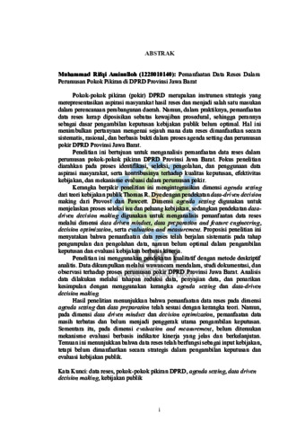 Pokok-pokok pikiran (pokir) DPRD merupakan instrumen strategis yang merepresentasikan aspirasi masyarakat hasil reses dan menjadi salah satu masukan dalam perencanaan pembangunan daerah. Namun, dalam praktiknya, pemanfaatan data reses kerap diposisikan sebatas kewajiban prosedural, sehingga perannya sebagai dasar pengambilan keputusan kebijakan publik belum optimal. Hal ini menimbulkan pertanyaan mengenai sejauh mana data reses dimanfaatkan secara sistematis, rasional, dan berbasis bukti dalam proses agenda setting dan perumusan pokir DPRD Provinsi Jawa Barat. Penelitian ini bertujuan untuk menganalisis pemanfaatan data reses dalam perumusan pokok-pokok pikiran DPRD Provinsi Jawa Barat. Fokus penelitian diarahkan pada proses identifikasi, seleksi, pengolahan, dan penggunaan data aspirasi masyarakat, serta kontribusinya terhadap kualitas keputusan, efektivitas kebijakan, dan mekanisme evaluasi dalam perumusan pokir. Kerangka berpikir penelitian ini mengintegrasikan dimensi agenda setting dari teori kebijakan publik Thomas R. Dye dengan pendekatan data-driven decision making dari Provost dan Fawcett. Dimensi agenda setting digunakan untuk menjelaskan proses seleksi isu dan peluang kebijakan, sedangkan pendekatan data-driven decision making digunakan untuk menganalisis pemanfaatan data reses melalui dimensi data driven mindset, data preparation and feature engineering, decision optimization, serta evaluation and measurement. Proposisi penelitian ini menyatakan bahwa pemanfaatan data reses telah berjalan sistematis pada tahap pengumpulan dan pengolahan data, namun belum optimal dalam pengambilan keputusan dan evaluasi kebijakan berbasis kinerja. Penelitian ini menggunakan pendekatan kualitatif dengan metode deskriptif analitis. Data dikumpulkan melalui wawancara mendalam, studi dokumentasi, dan observasi terhadap proses perumusan pokir DPRD Provinsi Jawa Barat. Analisis data dilakukan melalui tahapan reduksi data, penyajian data, dan penarikan kesimpulan dengan menggunakan kerangka agenda setting dan data-driven decision making. Hasil penelitian menunjukkan bahwa pemanfaatan data reses pada dimensi agenda setting dan data preparation telah sesuai dengan kerangka teori. Namun, pada dimensi data driven mindset dan decision optimization, pemanfaatan data masih terbatas dan belum menjadi penggerak utama pengambilan keputusan. Sementara itu, pada dimensi evaluation and measurement, belum ditemukan mekanisme evaluasi berbasis indikator kinerja yang jelas dan berkelanjutan. Temuan ini menunjukkan bahwa data reses telah berfungsi sebagai input kebijakan, tetapi belum dimanfaatkan secara strategis dalam pengambilan keputusan dan evaluasi kebijakan publik.