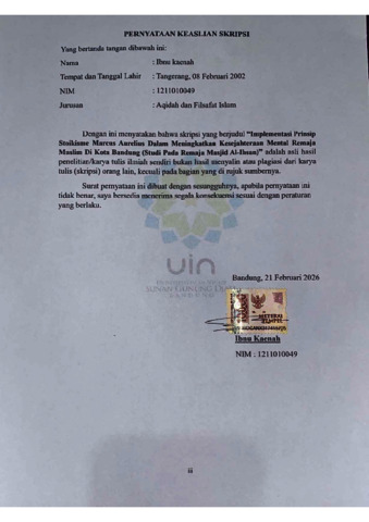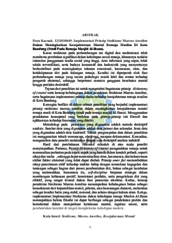 Kaenah, Ibnu (2026) Implementasi prinsip Stoikisme Marcus Aurelius dalam meningkatkan kesejahteraan mental remaja muslim di Kota Bandung: Studi pada Remaja Masjid Al-Ihsan. Sarjana thesis, UIN Sunan Gunung Djati Bandung.