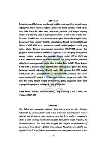 | Uncontrolled Keywords: | Prediksi Penjualan Mobil; Deep Learning; CNN; LSTM; Fine Tuning; CRISP-DM |