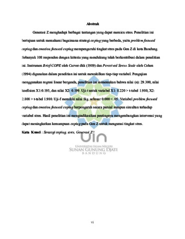 English: Generation Z faces various challenges that can trigger stress. This research aims to understand how different coping strategies, namely problem focused coping and emotion focused coping, influence stress levels in Gen Z in the city of Bandung. A total of 108 respondents with supporting criteria contributed to this research. The Brief-COPE instrument by Carver et al (1989) and the Perceived Stress Scale by Cohen (1994) were used in this research to represent each variable. Testing using multiple linear regression, this research found that the value (α): 29,300, the coefficient value X1: 0.195, and the value X2: 0.199. T-test for variable X1: 8.220 > t-table 1.980, X2: 2.808 > t-table 1.980. The f-test has a Sig value. of 0.000 < .05. The variables problem focused coping and emotion focused coping have a partial or simultaneous effect on the stress variable. Bahasa: Generasi Z menghadapi berbagai tantangan yang dapat memicu stres. Penelitian ini bertujuan untuk memahami bagaimana strategi coping yang berbeda, yaitu problem focused coping dan emotion focused coping mempengaruhi tingkat stres pada Gen Z di kota Bandung. Sebanyak 108 responden dengan kriteria yang mendukung telah berkontribusi dalam penelitian ini. Instrumen Brief-COPE oleh Carver dkk (1989) dan Perceived Stress Scale oleh Cohen (1994) digunakan dalam penelitian ini untuk mewakilkan tiap-tiap variabel. Pengujian menggunakan regresi linear berganda, penelitian ini menemukan bahwa nilai (α): 29.300, nilai koefisien X1:0.195, dan nilai X2: 0.199. Uji-t untuk variabel X1: 8.220 > t-tabel 1.980, X2: 2.808 > t-tabel 1.980. Uji-f memiliki nilai Sig. sebesar 0.000 < .05. Variabel problem focused coping dan emotion focused coping berpengaruh secara parsial maupun simultan terhadap variabel stres.