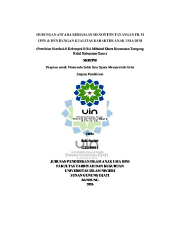 Savitri, Bela (2026) Hubungan antara kebiasaan menonton tayangan film upin dan ipin dengan kualitas karakter anak usia dini: Penelitian korelasi di kelompok B RA Miftahul Khoer Kecamatan Tarogong Kidul Kabupaten Garut. Sarjana thesis, UIN Sunan Gunung Djati Bandung.