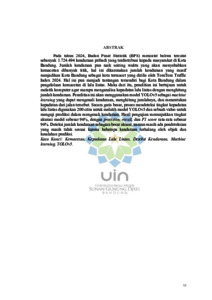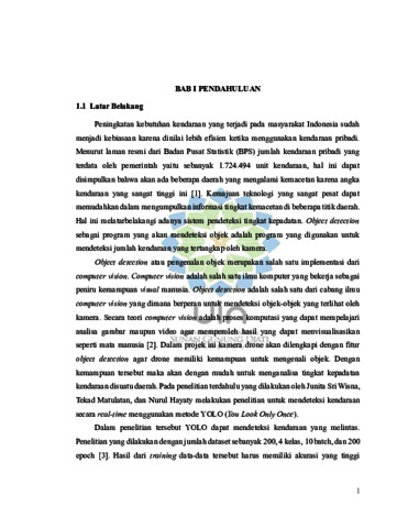 BAHASA INDONESIA : Pada tahun 2024, Badan Pusat Statistik (BPS) mencatat bahwa tercatat sebanyak 1.724.494 kendaraan pribadi yang terdistribusi kepada masyarakat di Kota Bandung. Jumlah kendaraan pun naik seiring waktu yang akan menyebabkan kemacetan dibanyak titik, hal ini dikarenakan jumlah kendaraan yang masif menjadikan Kota Bandung sebagai kota termacet yang dirilis oleh TomTom Traffic Index 2024. Hal ini pun menjadi tantangan tersendiri bagi Kota Bandung dalam pengelolaan kemacetan di lalu lintas. Maka dari itu, penelitian ini bertujuan untuk melatih komputer agar mampu menganalisa kepadatan lalu lintas dengan menghitung jumlah kendaraan. Penelitian ini akan menggunakan model YOLOv5 sebagai machine learning yang dapat mengenali kendaraan, menghitung jumlahnya, dan menentukan kepadatan dari jalan tersebut. Secara garis besar, proses mendeteksi tingkat kepadatan lalu lintas digunakan 200 citra untuk melatih model YOLOv5 dan sebuah video untuk menguji prediksi dalam mengenali kendaraan. Hasil pengujian menunjukkan tingkat akurasi model sebesar 96%, dengan precision, recall, dan F1 score rata-rata sebesar 96%. Deteksi jumlah kendaraan sebagian besar akurat, namun masih ada pendeteksian yang masih tidak sesuai karena beberapa kendaraan terhalang oleh objek dan kesalahan prediksi. ENGLISH : In 2024, the Central Statistics Agency (BPS) recorded that there were 1,724,494 private vehicles distributed to the community in the city of Bandung. The number of vehicles has increased over time, causing congestion at many points. This is because the massive number of vehicles has made Bandung the most congested city, as reported by the TomTom Traffic Index 2024. This poses a unique challenge for Bandung in managing traffic congestion. Therefore, this study aims to train computers to analyse traffic density by counting the number of vehicles. This study will use the YOLOv5 model as machine learning that can recognise vehicles, count their numbers, and determine the density of the road. In general, the process of detecting traffic density levels uses 200 images to train the YOLOv5 model and a video to test predictions in recognising vehicles. The test results show a model accuracy level of 96%, with an average precision, recall, and F1 score of 96%. Vehicle count detection is largely accurate, but there are still some inaccurate detections due to vehicles being obstructed by objects and prediction errors.