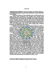 Sumber Daya Manusia di dunia pendidikan (guru), memiliki peranan yang sangat penting karena kontribusinya yang signifikan untuk mencapai tujuan Pendidikan Nasional. Namun kenyataan di lapangan, guru sebagai manusia biasa yang memiliki persoalan eksternal yang membebani mereka dalam mengerjakan tugasnya, ditambah pergantian kurikulum yang kerap kali dilakukan ketika pergantian pemerintahan, dan juga beban administratif yang kerap menjadi kendala. Melihat kekurangan tersebut, Yayasan Fathul Huda membuat program diklat at- ta'dib yang diselenggarakan oleh yayasan sendiri sehingga dapat membekali kompetensi guru dalam menjalankan tugasnya. Penelitian ini bertujuan untuk: 1) Mendeskripsikan implementasi diklat at- ta’dib di Yayasan Fathul Huda Kota Bandung; 2) Mendeskripsikan peningkatan kompetensi guru di Yayasan Fathul Huda Kota Bandung; 3) Menganalisis hubungan implementasi diklat at-ta’dib dengan peningkatan kompetensi guru. Penelitian ini menggunakan pendekatan kuantitatif dengan metode deskriptif. Pengumpulan data dilakukan melalui penyebaran angket dan studi dokumentasi. Hasil penelitian menunjukkan bahwa: 1). Implementasi diklat At-ta’dib di Yayasan Fathul Huda Kota Bandung memiliki jumlah nilai rata-rata 3,96 yang berada pada skala 3,50-4,50 yang termasuk kedalam kategori “Tinggi”. Hal ini dapat diartikan bahwa responden memiliki respon yang tinggi terhadap implementasi diklat at-ta’dib yang dapat dilihat dari reaksi terhadap diklat, Pelajaran diklat. Perubahan perilaku setelah dilakukan diklat, hasil diklat, metode diklat dan evaluasi diklat; 2). Peningkatan kompetensi guru di Yayasan Fathul Huda Kota Bandung dapat dikatakan sangat baik karena memiliki jumlah nilai rata-rata 4,30 yang berada pada skala 3,50-4,50 yang termasuk ke dalam kategori “Tinggi”. Hal ini dapat diartikan bahwa responden memiliki respon yang tinggi terhadap peningkatan kompetensi guru yang dapat dilihat dari kompetensi pedagogic, kompetensi kepribadian, kompetensi sosial, kompetensi professional, kompetensi spiritual, dan kompetensi leadership; 3). Implementasi diklat at-ta’dib memiliki hubungan yang sedang dengan peningkatan kompetensi guru di Yayasan Fathul Huda Kota Bandung. Hal ini diperoleh dapat dilihat dari hasil uji korelasi yang bernilai 0,538 (Kategori Sedang). Selain itu, dari hasil R Square dapat dilihat implementasi diklat at-ta’dib dengan peningkatan kompetensi guru memiliki hubungan sebesar 28,9% . Hal ini mengindikasi bahwa 28,9% peningkatan kompetensi guru dapat dijelaskan oleh implementasi diklat at-ta’dib.