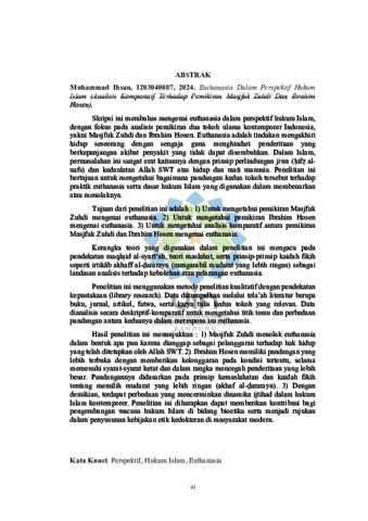 Skripsi ini membahas mengenai euthanasia dalam perspektif hukum Islam, dengan fokus pada analisis pemikiran dua tokoh ulama kontemporer Indonesia, yakni Masjfuk Zuhdi dan Ibrahim Hosen. Euthanasia adalah tindakan mengakhiri hidup seseorang dengan sengaja guna menghindari penderitaan yang berkepanjangan akibat penyakit yang tidak dapat disembuhkan. Dalam Islam, permasalahan ini sangat erat kaitannya dengan prinsip perlindungan jiwa (ḥifẓ al-nafs) dan kedaulatan Allah SWT atas hidup dan mati manusia. Penelitian ini bertujuan untuk mengetahui bagaimana pandangan kedua tokoh tersebut terhadap praktik euthanasia serta dasar hukum Islam yang digunakan dalam membenarkan atau menolaknya. Tujuan dari penelitian ini adalah : 1) Untuk mengetahui pemikiran Masjfuk Zuhdi mengenai euthanasia. 2) Untuk mengetahui pemikiran Ibrahim Hosen mengenai euthanasia. 3) Untuk mengetahui analisis komparatif antara pemikiran Masjfuk Zuhdi dan Ibrahim Hosen mengenai euthanasia. Kerangka teori yang digunakan dalam penelitian ini mengacu pada pendekatan maqāṣid al-syarī‘ah, teori maslahat, serta prinsip-prinsip kaidah fikih seperti irtikāb akhaff al-ḍararayn (mengambil mudarat yang lebih ringan) sebagai landasan analisis terhadap kebolehan atau pelarangan euthanasia. Penelitian ini menggunakan metode penelitian kualitatif dengan pendekatan kepustakaan (library research). Data dikumpulkan melalui tela’ah literatur berupa buku, jurnal, artikel, fatwa, serta karya tulis kedua tokoh yang relevan. Data dianalisis secara deskriptif-komparatif untuk mengetahui titik temu dan perbedaan pandangan antara keduanya dalam merespons isu euthanasia. Hasil penelitian ini menunjukkan : 1) Masjfuk Zuhdi menolak euthanasia dalam bentuk apa pun karena dianggap sebagai pelanggaran terhadap hak hidup yang telah ditetapkan oleh Allah SWT. 2) Ibrahim Hosen memiliki pandangan yang lebih terbuka dengan memberikan kelonggaran pada kondisi tertentu, selama memenuhi syarat-syarat ketat dan dalam rangka mencegah penderitaan yang lebih besar. Pandangannya didasarkan pada prinsip kemaslahatan dan kaidah fikih tentang memilih mudarat yang lebih ringan (akhaf al-ḍararayn). 3) Dengan demikian, terdapat perbedaan yang mencerminkan dinamika ijtihad dalam hukum Islam kontemporer. Penelitian ini diharapkan dapat memberikan kontribusi bagi pengembangan wacana hukum Islam di bidang bioetika serta menjadi rujukan dalam penyusunan kebijakan etik kedokteran di masyarakat modern.