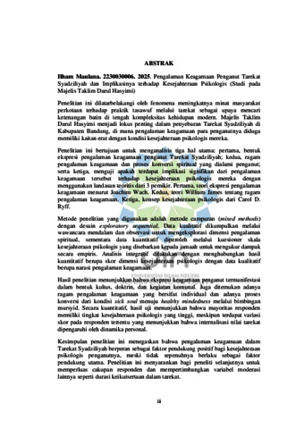 INDONESIA: Penelitian ini dilatarbelakangi oleh fenomena meningkatnya minat masyarakat perkotaan terhadap praktik tasawuf melalui tarekat sebagai upaya mencari ketenangan batin di tengah kompleksitas kehidupan modern. Majelis Taklim Darul Hasyimi menjadi lokus penting dalam penyebaran Tarekat Syadziliyah di Kabupaten Bandung, di mana pengalaman keagamaan para penganutnya diduga memiliki kaitan erat dengan kondisi kesejahteraan psikologis mereka. Penelitian ini bertujuan untuk menganalisis tiga hal utama: pertama, bentuk ekspresi pengalaman keagamaan penganut Tarekat Syadziliyah; kedua, ragam pengalaman keagamaan dan proses konversi spiritual yang dialami penganut; serta ketiga, menguji apakah terdapat implikasi signifikan dari pengalaman keagamaan tersebut terhadap kesejahteraan psikologis mereka dengan menggunakan landasan teoritis dari 3 pemikir. Pertama, teori ekspresi pengalaman keagamaan menurut Joachim Wach. Kedua, teori William James tentang ragam pengalaman keagamaan. Ketiga, konsep kesejahteraan psikologis dari Carol D. Ryff. Metode penelitian yang digunakan adalah metode campuran (mixed methods) dengan desain exploratory sequential. Data kualitatif dikumpulkan melalui wawancara mendalam dan observasi untuk mengeksplorasi dimensi pengalaman spiritual, sementara data kuantitatif diperoleh melalui kuesioner skala kesejahteraan psikologis yang disebarkan kepada jamaah untuk mengukur dampak secara empiris. Analisis integratif dilakukan dengan menghubungkan hasil kuantitatif berupa skor dimensi kesejahteraan psikologis dengan data kualitatif berupa narasi pengalaman keagamaan. Hasil penelitian menunjukkan bahwa ekspresi keagamaan penganut termanifestasi dalam bentuk kultus, doktrin, dan kegiatan komunal. Juga ditemukan adanya ragam pengalaman keagamaan yang bersifat individual dan adanya proses konversi dari kondisi sick soul menuju healthy mindedness melalui bimbingan mursyid. Secara kuantitatif, hasil uji menunjukkan bahwa mayoritas responden memiliki tingkat kesejahteraan psikologis yang tinggi, meskipun terdapat variasi skor pada responden tertentu yang menunjukkan bahwa internalisasi nilai tarekat dipengaruhi oleh dinamika personal. Kesimpulan penelitian ini menegaskan bahwa pengalaman keagamaan dalam Tarekat Syadziliyah berperan sebagai faktor pendukung positif bagi kesejahteraan psikologis penganutnya, meski tidak sepenuhnya berlaku sebagai faktor pendukung utama. Penelitian ini menyarankan bagi peneliti selanjutnya untuk memperluas cakupan responden dan mempertimbangkan variabel moderasi lainnya seperti durasi keikutsertaan dalam tarekat. ENGLISH: This research is motivated by the growing interest of urban communities in the practice of Sufism through the order as a means of seeking inner peace amidst the complexities of modern life. The Majelis Taklim Darul Hasyimi has become an important locus in the spread of the Syadziliyah Order in Bandung Regency, where the religious experiences of its followers are thought to be closely related to their psychological well-being. This study aims to analyze three main issues: first, the forms of expression of religious experiences of followers of the Syadziliyah Order; second, the variety of religious experiences and the process of spiritual conversion experienced by followers; and third, to examine whether there are significant implications of these religious experiences for their psychological well-being using theoretical foundations from three thinkers. First, the theory of the expression of religious experience according to Joachim Wach. Second, William James's theory on the variety of religious experience. Third, Carol D. Ryff's concept of psychological well-being. The research method used was a mixed methods approach with an exploratory sequential design. Qualitative data were collected through in-depth interviews and observations to explore the dimensions of spiritual experience, while quantitative data were obtained through a psychological well-being scale questionnaire distributed to congregants to empirically measure the impact. An integrative analysis was conducted by linking the quantitative results, in the form of psychological well-being dimension scores, with the qualitative data in the form of narratives of religious experiences. The results showed that adherents' religious expression manifested itself in cults, doctrines, and communal activities. A variety of individual religious experiences were also identified, as well as a process of conversion from a sick soul to a healthy mind through the guidance of a spiritual leader (mursyid). Quantitatively, the test results showed that the majority of respondents had a high level of psychological well-being, although there was variation in scores among certain respondents, indicating that the internalization of the tarekat's values was influenced by personal dynamics. The conclusion of this study confirms that religious experience within the Syadziliyah Tarekat plays a positive supporting factor in the psychological well-being of its adherents, although it does not necessarily act as the primary supporting factor. This study suggests that future researchers expand the scope of respondents and consider other moderating variables such as the duration of participation in the congregation. ARABIC: يستند هذا البحث إلى الاهتمام المتزايد لدى المجتمعات الحضرية بممارسة التصوف من خلال الطريقة السيدزيلية كوسيلة للبحث عن السكينة الداخلية وسط تعقيدات الحياة المعاصرة. وقد أصبح مجلس التكليف دار الهاشمي مركزًا هامًا لانتشار الطريقة السيدزيلية في مقاطعة باندونغ، حيث يُعتقد أن التجارب الدينية لأتباعها ترتبط ارتباطًا وثيقًا بصحتهم النفسية. تهدف هذه الدراسة إلى تحليل ثلاثة محاور رئيس