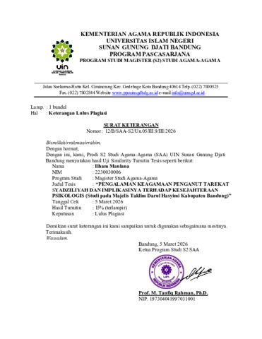 Uncontrolled Keywords: Studi Agama Agama; Psikologi Agama; Tarekat; Psikologi; Kesejahteraan Psikologis; Tasawuf
